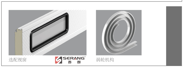 門簾機構:節製式門簾機構,由鋁合金簾片、軟連接膠條、承重膠鏈、導向輪等幾個部分組成,可選配透明視窗,軟連接部分折疊壽命達百萬次以上;通過聚氨脂材質的導向輪在鋁合金軌道內滑動,高速運行無磨擦和噪音。